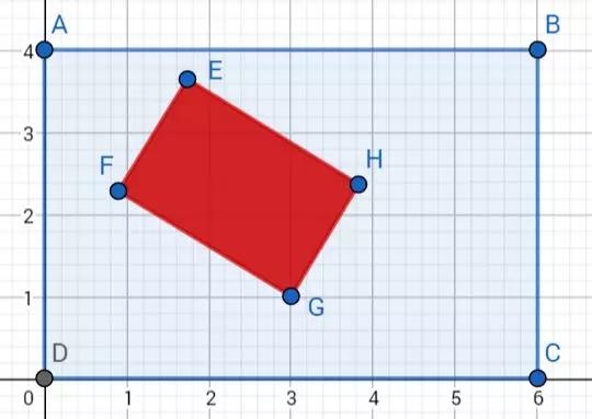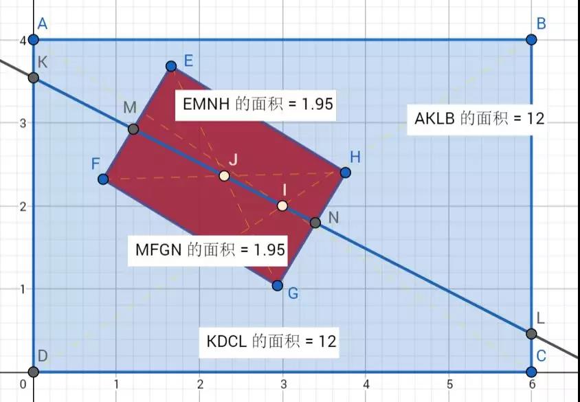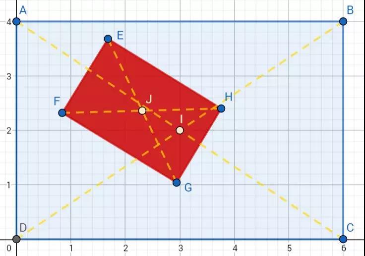 面包片(長方形ABCD)上面平鋪著一塊小火腿片(長方形EFGH),現在我們來動刀子了,怎么樣才能一刀(一條直線)切下去,使得面包片和火腿片剛好完全平分。