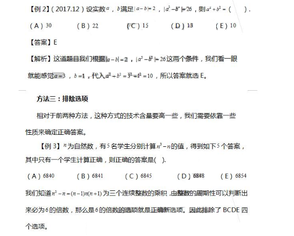 這種方法大家都很熟悉,主要用來(lái)減少計(jì)算所用的時(shí)間,比如在做應(yīng)用題時(shí),看完題目能立馬列出一個(gè)方程,但是卻是一個(gè)二元一次方程,你要想做出來(lái),要用一些其他的方法(比如:整除法,尾數(shù)法,奇偶法),最后能分析出來(lái),而對(duì)于一些在職的考生,平時(shí)的練習(xí)時(shí)間不多,對(duì)于這些方法不夠熟悉,運(yùn)算起來(lái)不夠嫻熟,那么我們此時(shí)就可以將選項(xiàng)代入所列的關(guān)系式中去驗(yàn)證,從而找出正確答案。