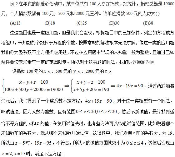 在我們管理類聯考中,大綱主要明確考查了四大模塊的內容:算數、代數、幾何、數據分析。但是我們從歷年的考試真題中卻發現占了大部分的考試題卻是應用題(大概8題左右),所以它很重要。有的考生會說,應用題我們在小學的時候就開始接觸了,無非就是列方程解應用題。不可否認,對各類考試中的應用題,列方程是解決應用題最優的方法,但我們管理類聯考中也會時不時的出現一些特殊的應用題,這類應用題他們可能列不出方程,或者盡管可以列出方程,但是方程的個數少于未知數的個數,按照常規的解方程的方法是無法解出來得,那么對于這一類的應用題,社科賽斯MBA輔導老師在這里給大家做出講解。