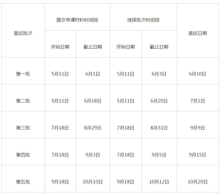 3、在非材料提交時間段內,考生隨時可登錄系統填寫并保存材料,以便在材料提交時間段內及時提交材料。在每個批次的材料提交時間段內,審核老師都將按照考生的提交時間順序審核材料。考生只要材料審核通過,就能選擇對應的批次,而每個批次的面試名額有限,根據歷年情況,每個批次都可能出現下列情況:在提交材料或者選擇批次的截止日期前,面試名額已滿。因此,提醒考生提前計劃,越早提交材料,選到目標批次的可能性越大。