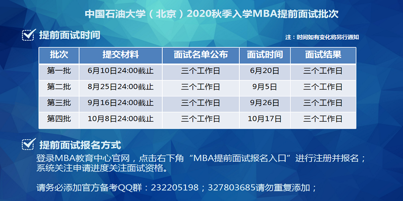 各高校已經陸續(xù)啟動提面面試,準備報考MBA專業(yè)的同學們一定要密切關注提前面試信息,因為參加提前面試能有效避免和畢業(yè)沒多久的考生競爭高分的尷尬,提高錄取機率,同時也有更多的機會向提前向招生院校提前展示自己的綜合素質能力。以下為MBA備考網小編為大家整理的“2020級中國石油大學(北京)MBA提前面試”,希望能對備考的你有所幫助!