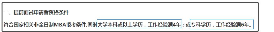 中南大學MBA自主劃線,擇優錄取,申請提前面試需滿足本科4年以上,??乒ぷ鹘涷灊M6年。