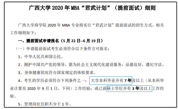 廣西大學2020MBA“君武計劃”只公布一批公告,目前已結束,但是我們可以看到參加提面的考生是不招收專科生的,且大學本科需7年,碩士需3年及以上工作經驗。