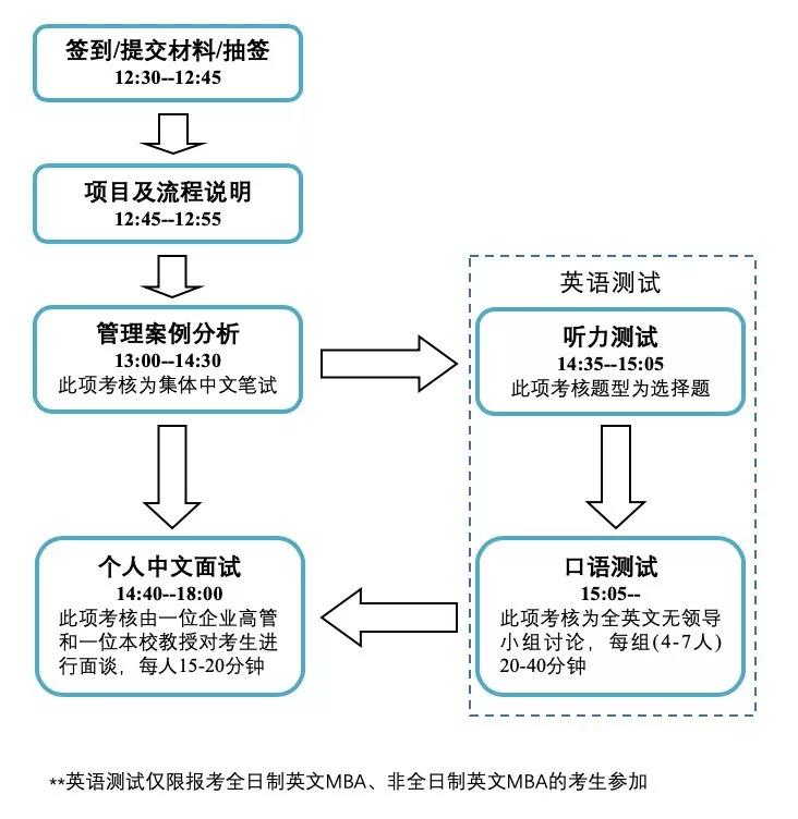 上外MBA預復試由管理案例分析、個人中文面試、英語測試(僅限報考全日制英文MBA、非全日制英文MBA的考生參加)三個環節構成。具體流程安排如下: