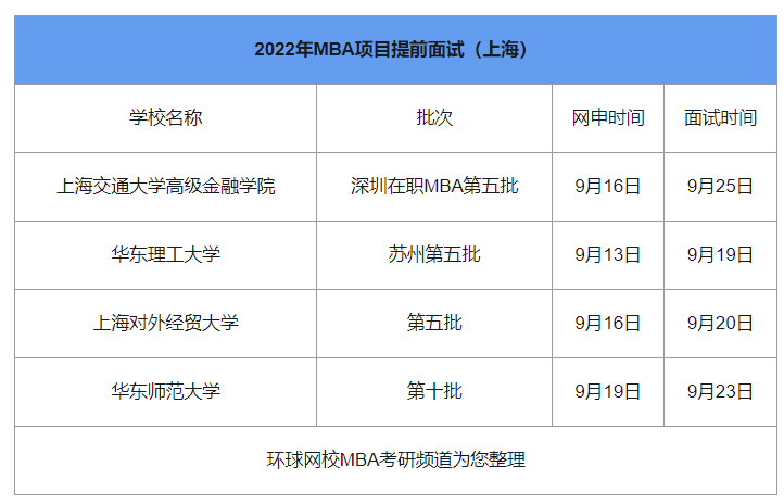 以上就是“2022MBA提前面試:2022年MBA提前面試:9月份第三周上海地區4所院校將截止申請”,更多相關信息,請持續關注本網站!