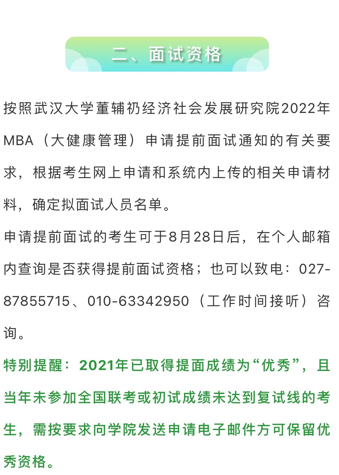 導讀:備戰2022年MBA考研的同學們,復習備考已經一段時間了。武漢大學發布了提前面試信息,為此社科賽斯小編為大家分享“2022MBA提前面試:提面 | 2022年武漢大學MBA(大健康管理)提前面試實施細則及時間安排”的資訊,希望對大家帶來幫助!