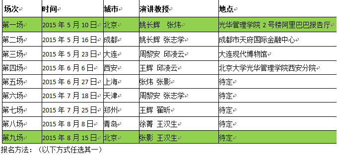 導讀:北京大學光華管理學院將于2015年5月至8月間,在北京、成都、大連、西安、上海、鄭州、青島等9城市再次舉行盛大的MBA全國公開課活動。