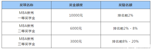 MBA TOP20新生獎(jiǎng)學(xué)金計(jì)劃將獎(jiǎng)勵(lì)錄取總成績(jī)排名前20%的全日制MBA第一志愿擬錄取考生,獎(jiǎng)勵(lì)分為3個(gè)等級(jí)。