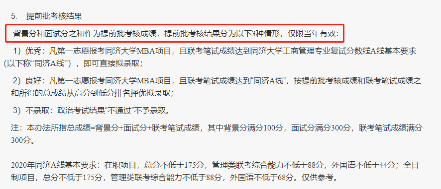 提前批面試成績排名優(yōu)秀(約占當(dāng)批面試通過人數(shù)的30%),且當(dāng)年報(bào)考了天津大學(xué)MBA的考生,如當(dāng)年聯(lián)考成績未能達(dá)到國家A線,其提前批面試通過資格可保留至第二年(即2021年的提前批面試成績可保留至2022年錄取時(shí)有效)。若第二年再次申請(qǐng)參加提前批面試,則上一年的提前批面試成績作廢,以第二年的提前批面試成績?yōu)闇?zhǔn)。