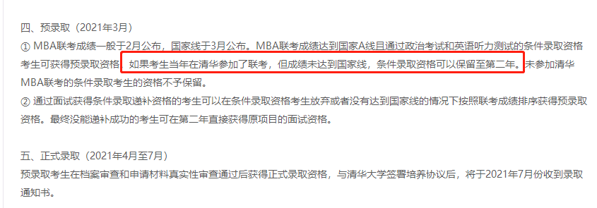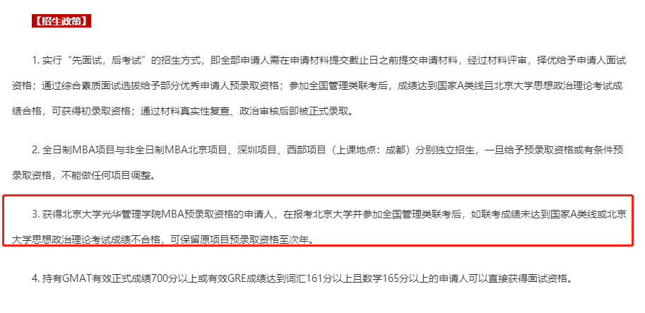獲得北京大學(xué)光華管理學(xué)院MBA預(yù)錄取資格的申請(qǐng)人,在報(bào)考北京大學(xué)并參加全國管理類聯(lián)考后,如聯(lián)考成績未達(dá)到國家A類線或北京大學(xué)思想政治理論考試成績不合格,可保留原項(xiàng)目預(yù)錄取資格至次年。