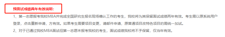 第一志愿報(bào)考我校MBA并完成全國研究生報(bào)名現(xiàn)場(chǎng)確認(rèn)工作的考生,我校將為其保留面試成績兩年有效。考生需以原系統(tǒng)用戶登錄,點(diǎn)擊重新申請(qǐng),方有效。如果考生需要項(xiàng)目變更,請(qǐng)郵件申請(qǐng),原普通項(xiàng)目改特色項(xiàng)目的需統(tǒng)一加試。