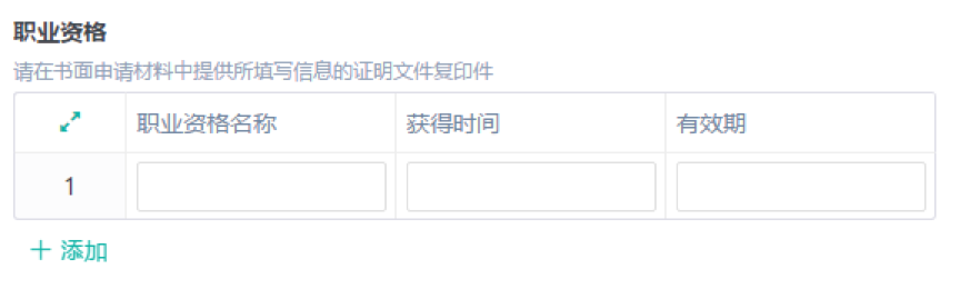 第十三步:填寫相關職業資格(可“添加”多種信息,沒有可不填;《材料附件匯總表》可提交相關材料電子版)
