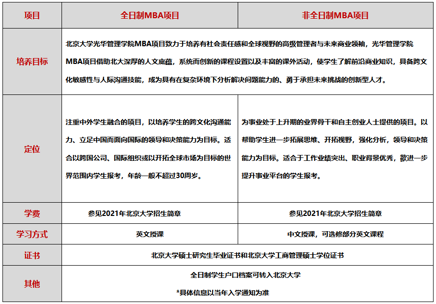 北京大學(xué)光華管理學(xué)院MBA2021年招生包含全日制MBA和非全日制MBA項(xiàng)目。