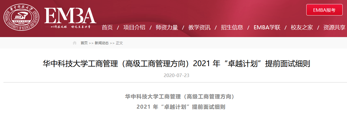 華中科技大學工商管理(高級工商管理方向)2021 年“卓越計劃”提前面試細則