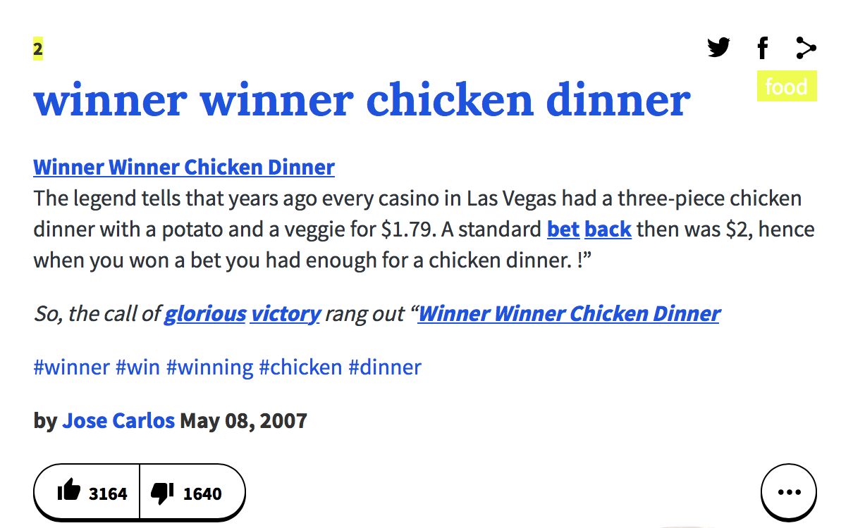 讓我們再回到英文本身:Winner Winner Chicken Dinner,出于本能的反應,我感覺這一定又是英文中的某個俚語。
