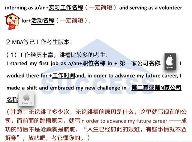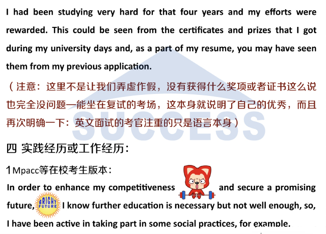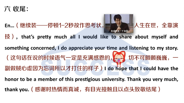 6 對于自我介紹中提到的關(guān)鍵信息,如教育背景,工作經(jīng)歷都要做拓展性的內(nèi)容準(zhǔn)備和語言準(zhǔn)備,因為這些提到的信息都可能成為考官追問的對象。所以,那些非重點信息的分享也一定點到為止,無非你就是要告訴考官你家大業(yè)大,再或者你是多么會玩,多么能作——過于細(xì)節(jié)的東西,無論是自我介紹時表達(dá)、或者隨后的提問在作答時都具有一定難度,特別是對于口語基礎(chǔ)比較一般的同學(xué)。