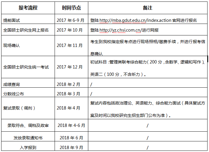 日程安排:以下日期有可能隨招生進展有所變動,最終日期以廣東工業大學MAB教育中心面試前公布的日期為準。廣東工業大學MBA教育中心保留根據申請的實際情況和面試的進展情況臨時減少或增加面試批次的權利。