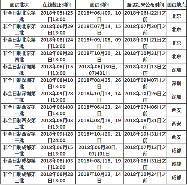 2019年非全日制MBA北京項目、深圳項目、西安項目、成都項目共設有13個申請批次,請申請人按規(guī)定時間在線提交材料;MBA項目根據(jù)申請人的材料進行評審后,定期組織面試。