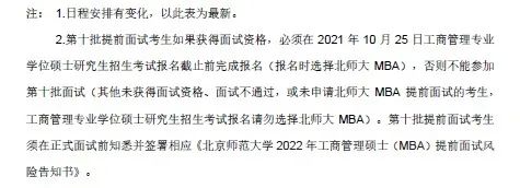 因2022年全國碩士研究生招生考試網(wǎng)上報名時間較往年有提前,北師大2022年MBA的提前面試批次及時間安排做出調(diào)整,最新見下圖及說明。